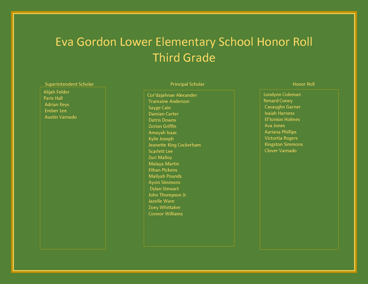 We are excited to announce our Honor Roll Eagles for the first nine weeks at Eva Gordon Lower Elementary School! 🦅 Your hard work and commitment have truly paid off, and we couldn’t be prouder. Congratulations to all our exceptional students—continue to reach for the stars! 🌟 #HonorRollEagles #ProudSchool