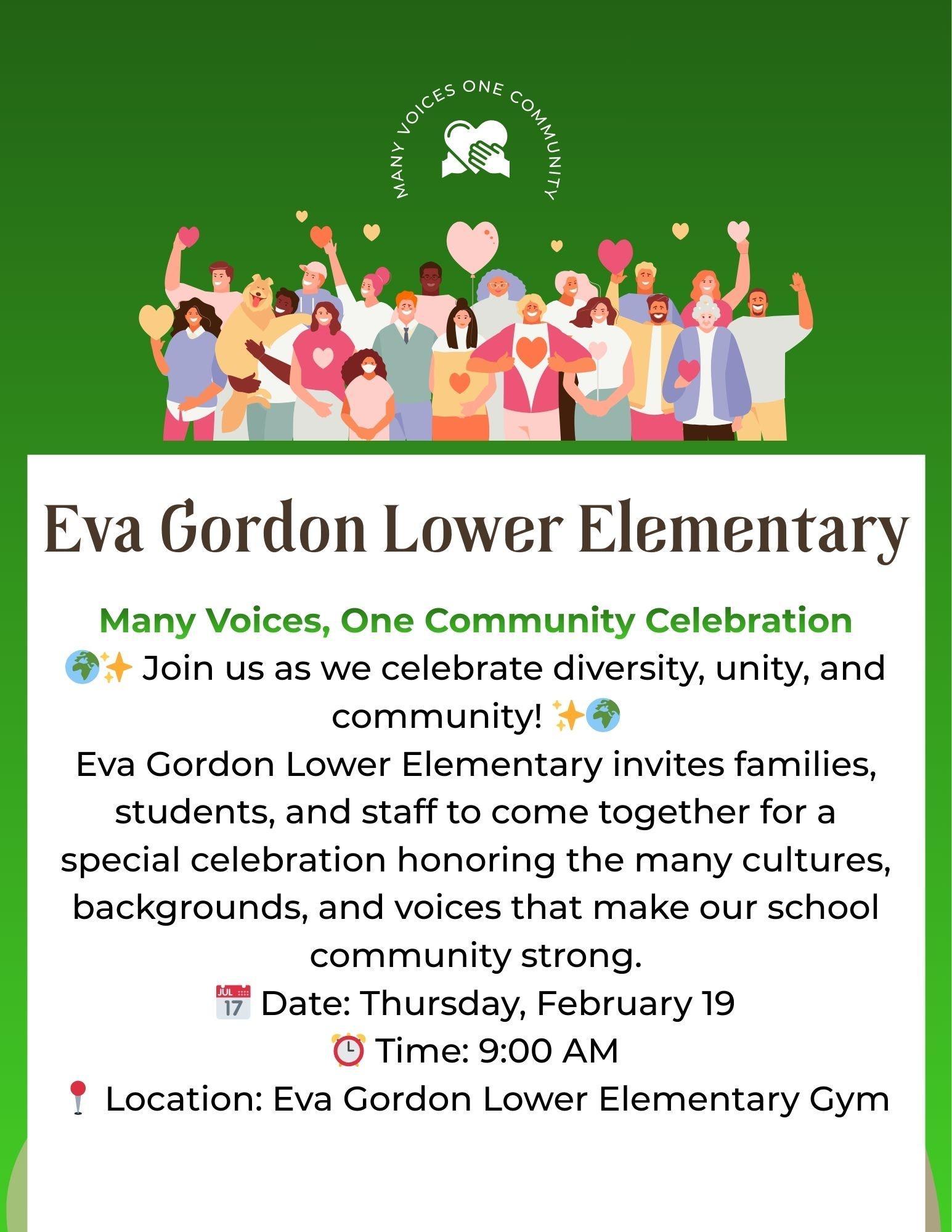Exciting news! 🎉 Eva Gordon Lower Elementary is hosting the "Many Voices, One Community Celebration" on Thursday, February 19, at 9 AM in our gym. This special event honors the diversity, unity, and unique voices that strengthen our school community. Families, students, and staff are all invited to join us in celebrating the rich tapestry of cultures and backgrounds that make our community so vibrant. Don't miss out on a day of joy and togetherness! 🌍❤️ #ManyVoicesOneCommunity