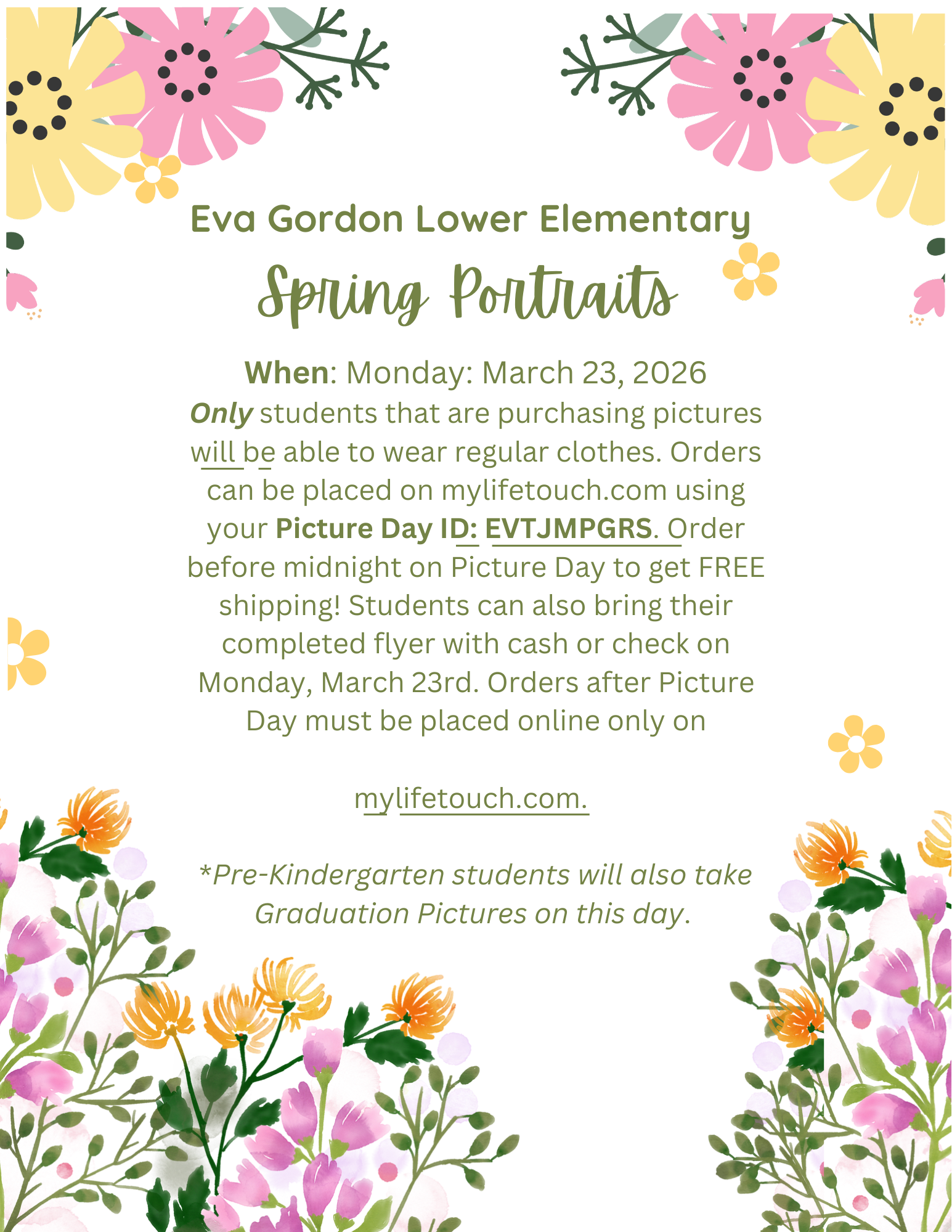 📸 Smile! Spring Portraits at Eva Gordon Lower Elementary are happening on Monday, March 23, 2026. Students purchasing pictures can wear regular clothes. Order at mylifetouch.com using Picture Day ID: EVTJMPGRS to enjoy FREE shipping on orders placed by midnight on Picture Day. Pre-K students will also have their Graduation Pictures taken. Bring your completed flyer with cash or check, or order online. Don’t miss out on capturing these memories!
