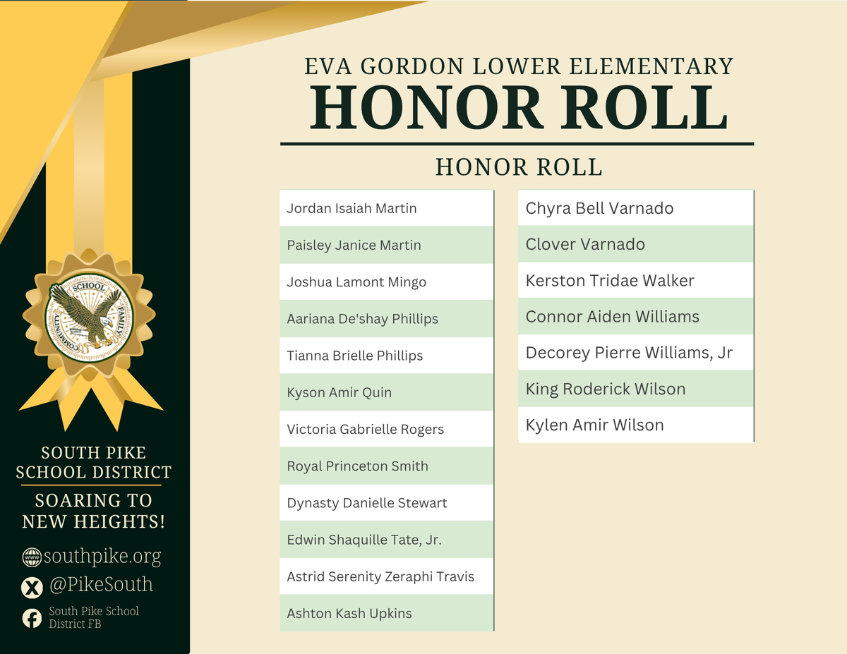 🎉 Congratulations to our amazing Honor Roll students at Eva Gordon Lower Elementary School for Term 3! We are so proud of your dedication and achievements. Keep soaring to new heights, little eagles! Let’s celebrate your hard work and success. Go South Pike! 🦅 #EaglePride #SoaringHigh